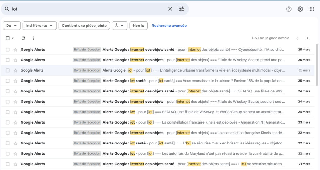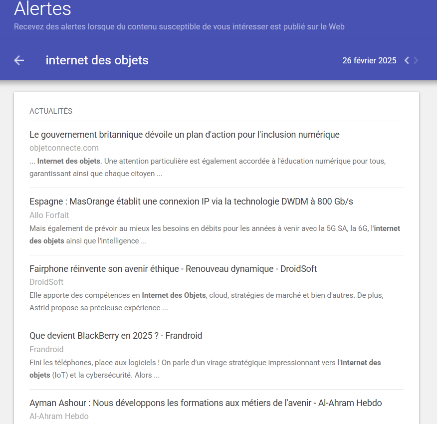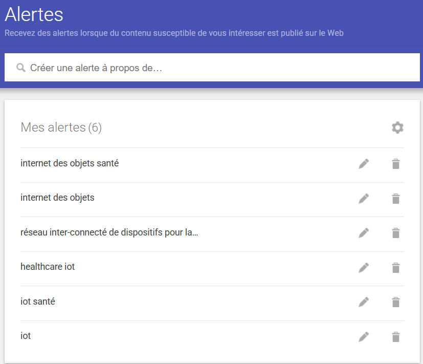 Les Alertes Google permettent de recevoir des e-mails sur du contenue choisi au préalables. Créer ces alertes vas nous permettre de suivre l’évolution des recherches posté en lignes en temp réel et ainsi cela vas faciliter la recherche: